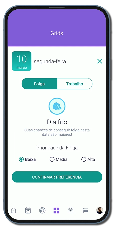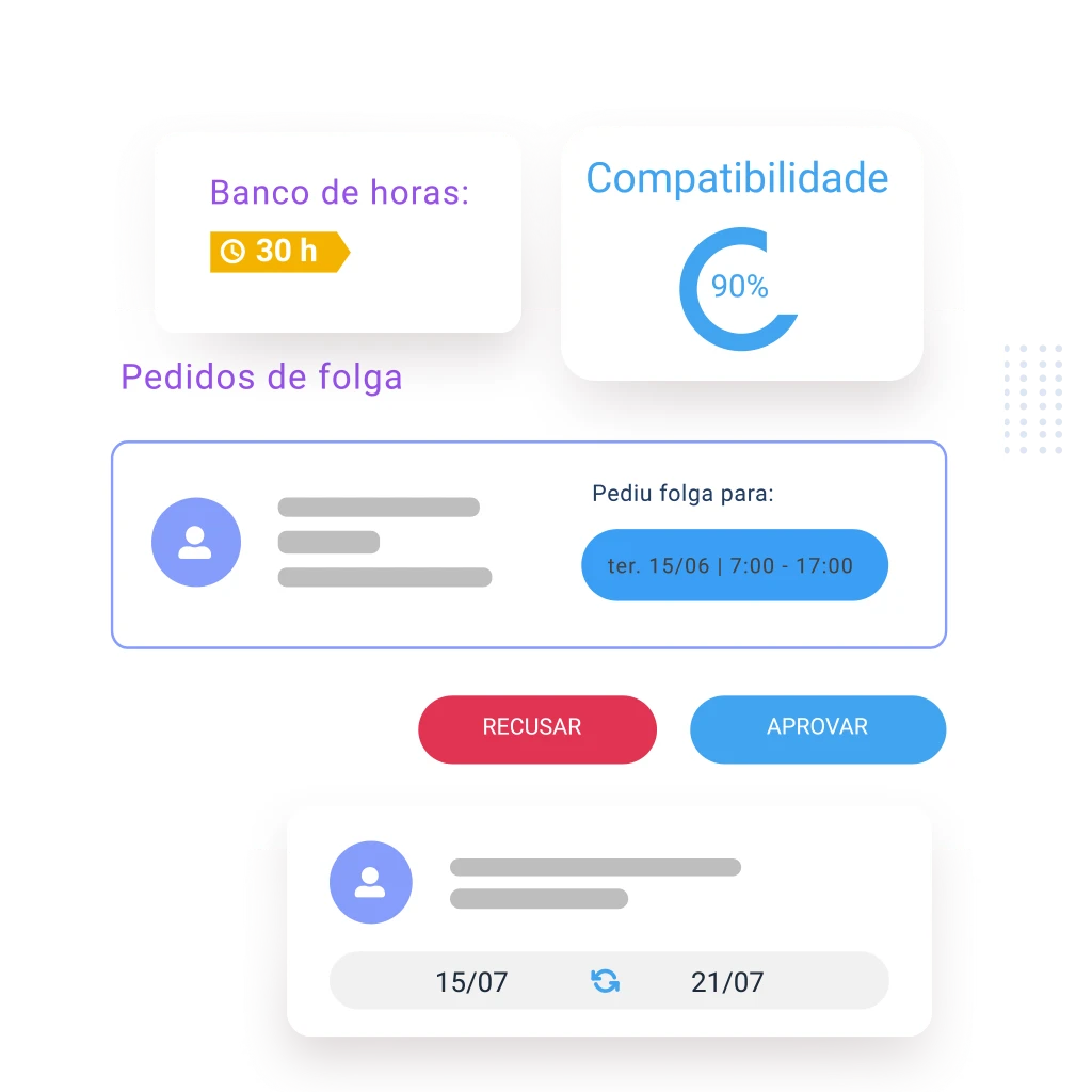 Eles escolhem folgas preferenciais. O sistema equilibra automaticamente.