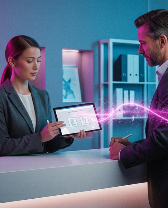 Entrada sem papel. Tablets capturam documentos e assinaturas. Fluxo direto para sistemas internos. Zero perda de tempo.